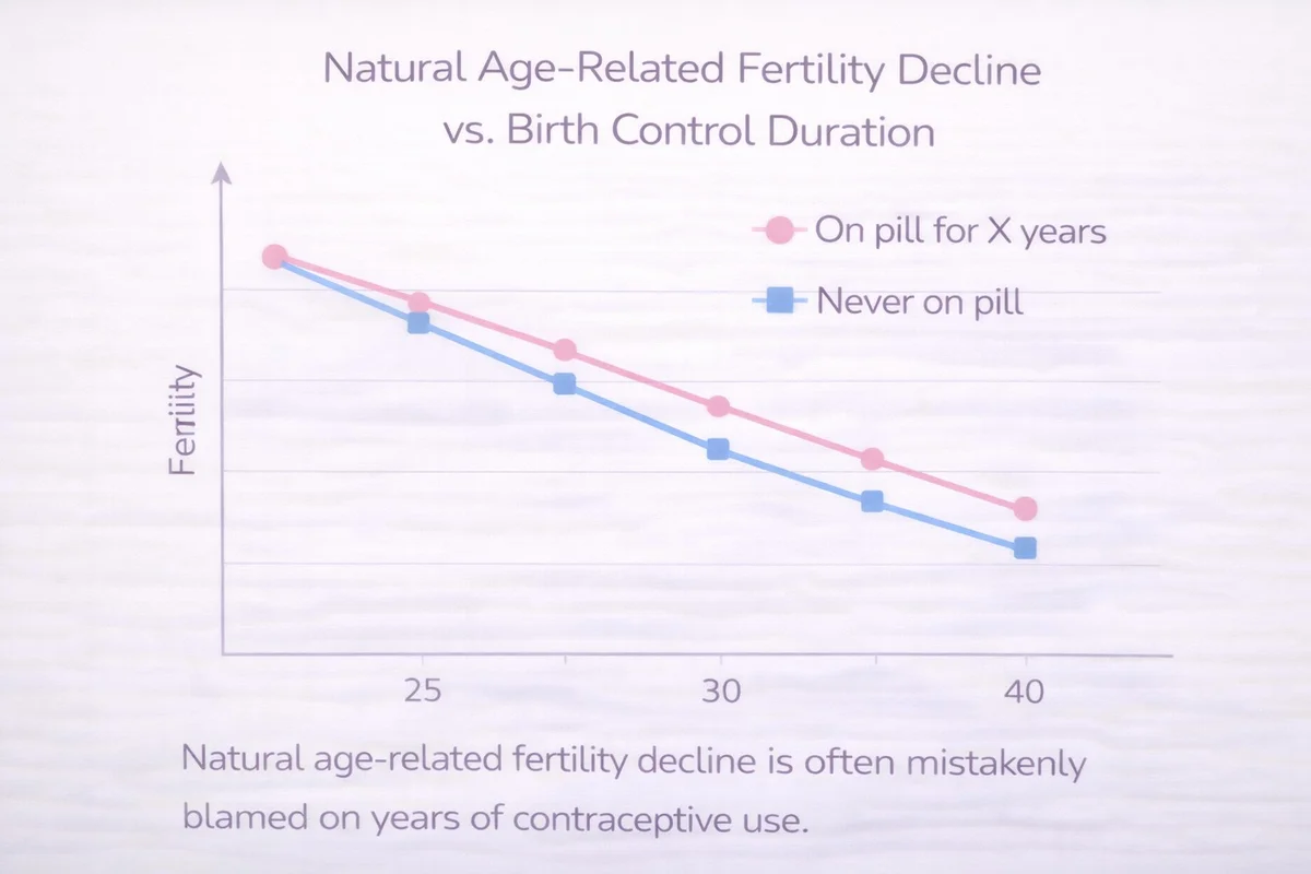 Age. Women who've been on the pill for 10 years are 10 years older than when they started. Fertility naturally declines with age—particularly after 35. The pill didn't cause the decline; aging did.