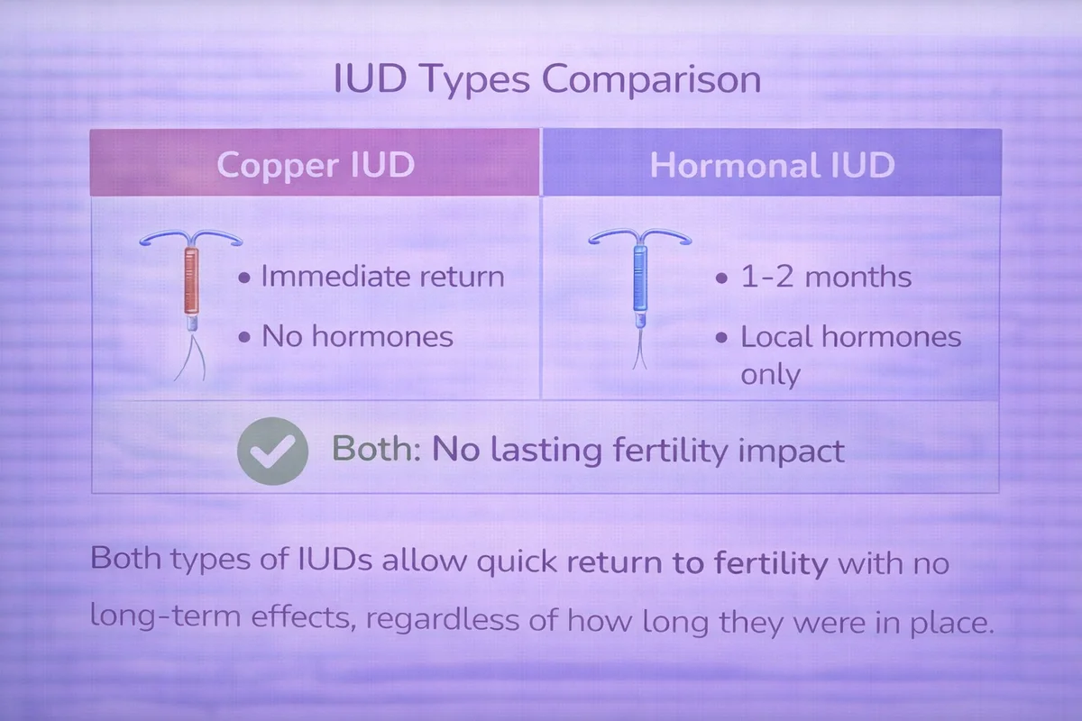 Copper vs Hormonal: Copper IUDs don't use hormones, so fertility can return immediately upon removal. Hormonal IUDs may take a week or two for your cycle to resume, but there's no long-term impact either way.