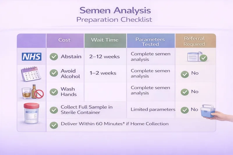 To access a semen analysis through the NHS, you'll typically need a GP referral. Most GPs will refer couples who have been trying to conceive for 12 months without success (or 6 months if the female partner is over 35). Your GP arranges the referral to a hospital andrology laboratory, where you'll be given an appointment.