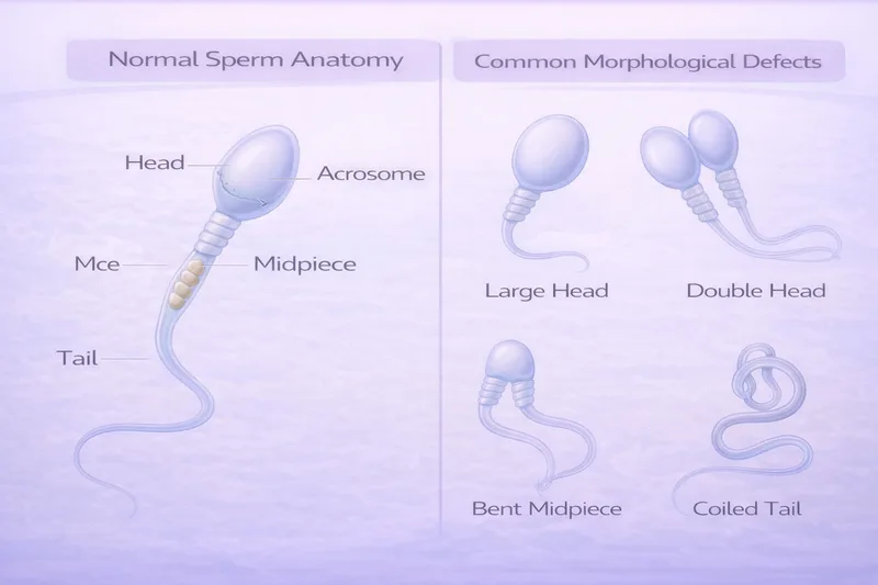 Head: Should be smooth, oval-shaped, with a well-defined acrosome (cap) covering 40–70% of the head. Defects include large heads, small heads, tapered heads, round heads, double heads, or vacuoles.