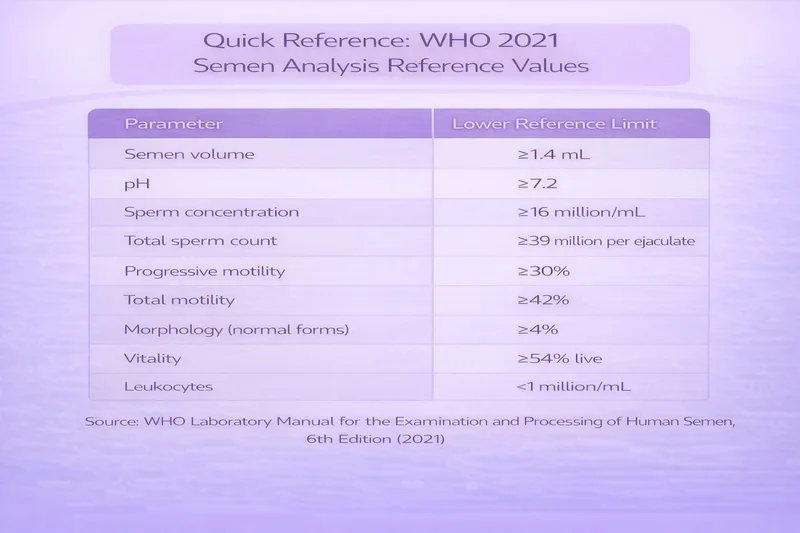 Your semen analysis report will contain multiple parameters, each compared against reference values established by the World Health Organization. The most recent reference values come from the WHO 6th Edition Manual (2021), which updated the previous 2010 criteria.
